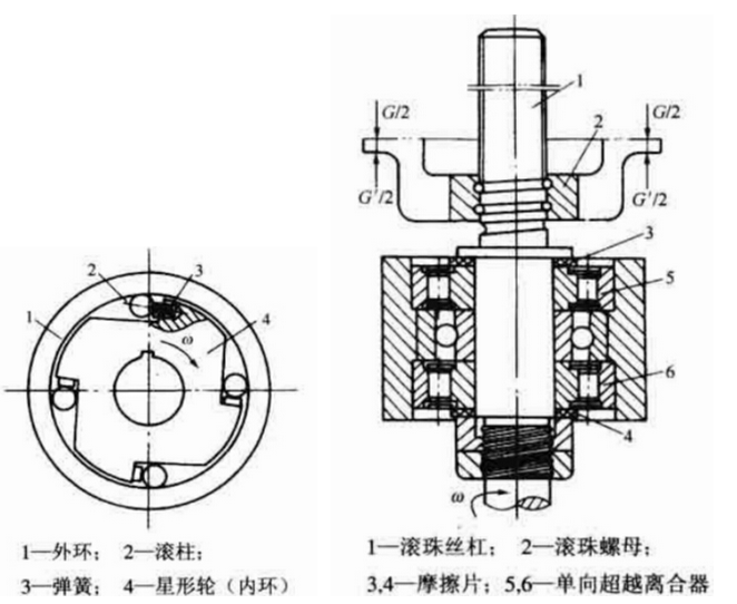 圖1是典型的單向超越離合器結(jié)構(gòu)圖。當星形輪(內(nèi)圈)4具有順時針旋轉(zhuǎn)的趨勢(即,反向旋轉(zhuǎn))時,如果將適當?shù)淖枇εぞ厥┘拥酵馊?上以大于反向扭矩,則可以防止其安裝連同內(nèi)圈4一起,滾珠絲杠順時針方向反轉(zhuǎn),僅允許逆時針方向旋轉(zhuǎn)。